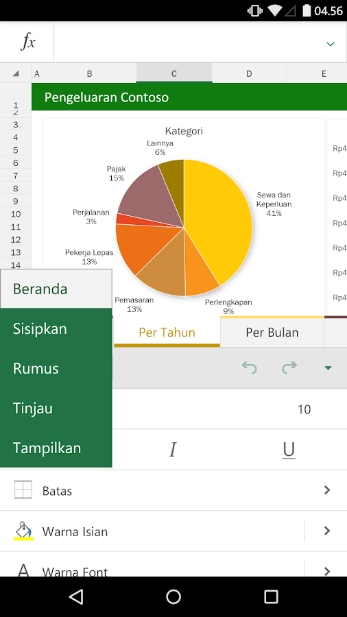 Kemudian untuk Microsoft Excel, memiliki sejumlah fitur yang hampir mirip dengan pada PC atau Notebook. Contohnya anda dapat membuat tabel, grafik, PivotTabel, dapat menyisipkan rumus sebagaimana telah tersedia pada aplikasi di PC. Untuk format pada aplikasi ini yang dapat dibuka yaitu .xls dan .xlsx. Sama halnya dengan Microsoft Word, anda juga dapat langsung menyimpan hasil kerja anda langsung pada tablet atau ponsel android anda dan juga pada aplikasi pihak ketiga seperti One Drive, Google Drive dan Share Point.